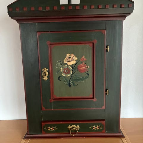 Lille væghængt skab, den er ældre trænger til en kærlig hånd. Den har en lille skade i udskæringen. Jeg har ikke pladsen, desværre