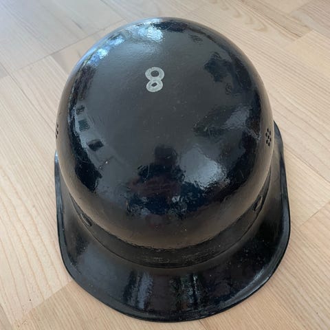 Ridser i lakken, hagerem skiftet engang, Skumgummi under grå kant inde i hjemlen er fjernet da det var helt smuldret, ellers helt intakt. En lille størrelse. 450 dkk.