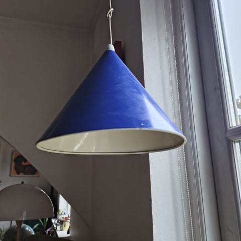 Hvid Louis Poulsen Billard pendel med porcelænsfatning. Har lidt ridser og en meget lille bule man nærmest ikke ser.