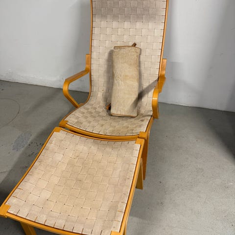 2 stk kopier af Albert lænestolen designet af Finn Østergaard med skammel til begge stole, meget velholdte. Stolene måler ca. H 105cm x B 63cm x D 60cm. En dansk designklassiker med høj siddekomfort.