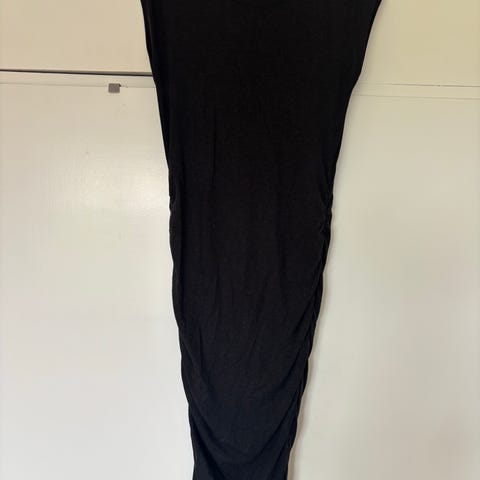 Brugt få gange. Lang sort maxikjole med elastik i taljen og over brystet. Måler 74 cm i den øverste elastik, 64 cm i taljeelastikken - begge ustrakte. Lænden er 127 cm.
