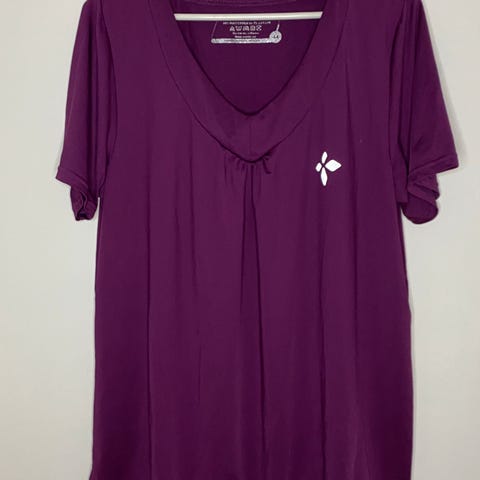 Vinrød med sort tryk på bryst. 92% bomuld/8 % elastane. Brugt få gange - er blevet for lille.