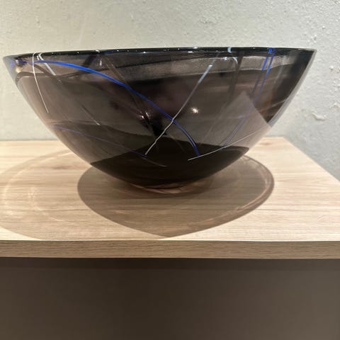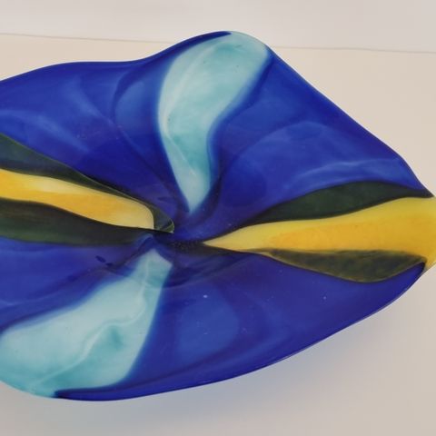 Glas, Fad, Ganske stor glasskål gule, blå og grønne farver. Mundblæst i Litauen ved Stiklo Studija Vilniaus. Fremstår flot og intakt med få brugsspor. Skålen måler ca. 22 cm høj og vejer 4400 gram.