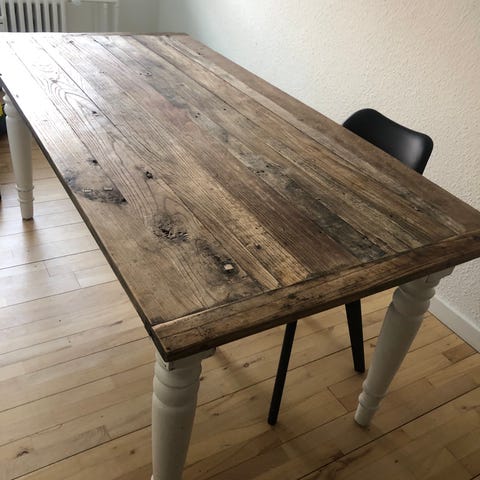 1 stk brugt stavlimet spisebord som har brugsspor, bordplade tykkelse på 4,5cm. L:119cm. B:80cm. H:74cm. Bordet er ikke nyt og sælges derfor som brugt, derfor kan der forekomme ridser, slid og skrammer. Prisen er kun 850kr.