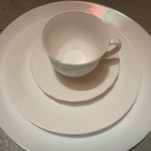 12 kopper, 12 underkopper, 12 kage tallerkener, 12 dybe tallerkener, 12 flade tallerkener samt skål, fad og sovseskål. Uden skår. Tåler maskinopvask. Skal afhentes.
