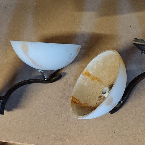 2 glas væglamper/up light. Ledningen måler ca. 200 cm og ca. 330 cm. Diameter ca. 30 cm. Højden ca. 12 cm. Er brugt, har få skår I kanten. Se billeder. I sin helhed i en rigtig flot stand.