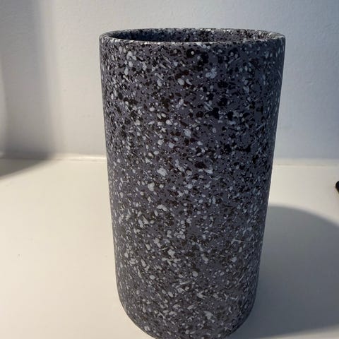 Matchende sæt med dispenser og krus i fin blå farve. Det er en form for stentøj tror jeg. Muligvis fra Søstrene Grene.