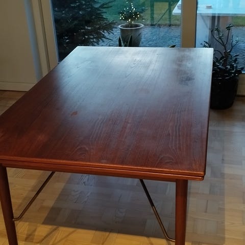 Spisebord m. 4 stole i teaktræ og læderbetræk fra Schiønning og Elgaard med hollandsk udtræk. Brugt, men i god stand. Enkelte brugsspor, se sidste billede. Kan blive 96 cm længere ved at trække plader ud i hver side (hollandsk udtræk).