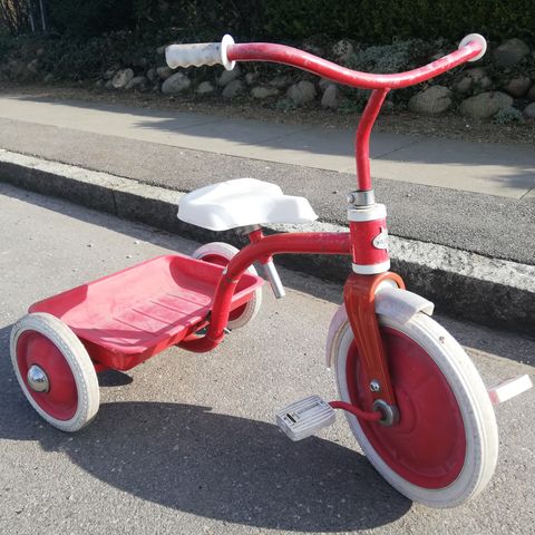 Klassisk rød ladcykel til de yngste. I fin stand, men man kan godt se, at den har været elsket af børn i en årrække.
