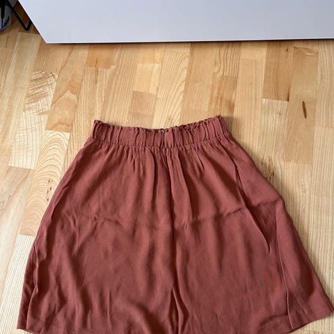 Rust-farvet nederdel med elastikbånd i taljen. Den har to lag, så den er ikke gennemsigtig. Meget luftig og behagelig. Højtaljet og går mig til midt på låret.