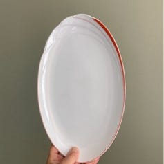 Smukt enkelt lagkagefad rødkant/ rødtop i fajance fra Royal Copenhagen. Designet af Grethe Meyer.
