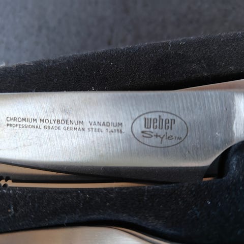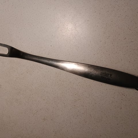 Weber stege gaffel. Perfekt til at holde på steg eller andet der skal udskæres. Eller til at vende kød på grillen. Fremstår meget velholdt.