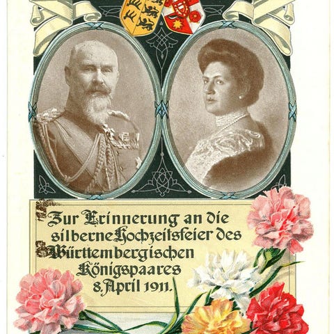 Mekanisk kort. Postkort i fin stand med det tyske kejserpar Wilhelm II og Auguste Victoria. Udgivet i anledning af deres sølvbryllup. Kortet er med prægetryk og med hjul i siderne. Når hjulet drejes, skifter billederne i trekanten for neden. Fremstår meget flot. Sendt til Horsens.