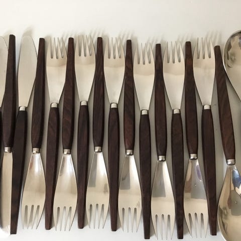 90 dele. Smukt og komplet vintage bestik fra Raadvad, designet af Henning Nørgaard i 1960’erne. Model “Eton” med palisanderhåndtag og rustfrit stål. Dansk design og håndværk i høj kvalitet.