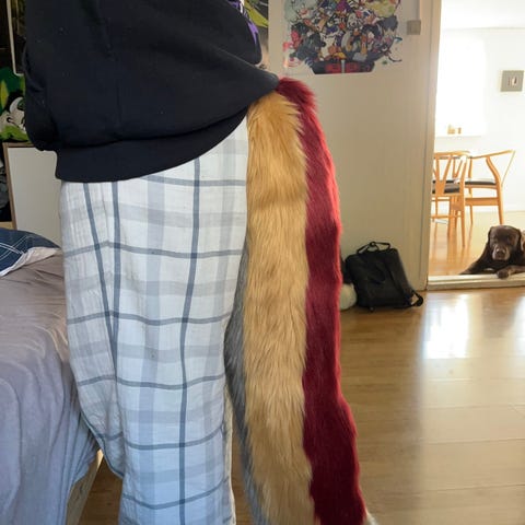 Rød, hvid og sort Fursuit/furry hale. Halen er 56cm og er lavedt med pels fra stoffhumlen