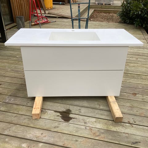 HTH hvid bad modul 60+80+60 m/låger, hvid m/ kirsebærtræ kant. Rusfri stålbeslag+ Grohe vask armatur. HTH bad modulk sælges uden keramik vask.