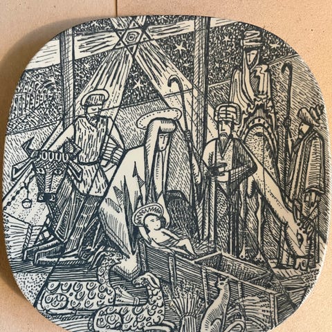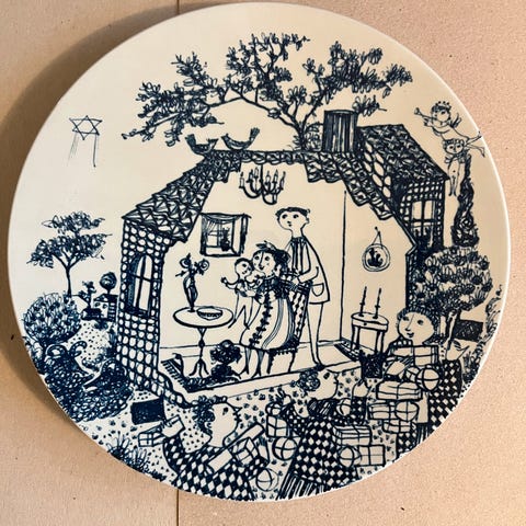 Nymolle Laursen Ravn tallerken i rød keramik. Designet af Laursen Ravn mellem 1953-1954. Tallerkenen har et unikt mønster og er velegnet til dekorative formål.