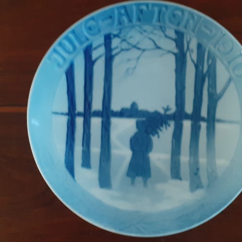 Juleplatte 1956 i porcelæn. Tallerkenen har et motiv i blå og hvid, der skildrer en juletradition. Diameteren er typisk for samleplatter fra denne periode. Velegnet til samlere eller som dekoration.
