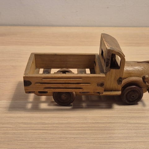 Gammel træ lastbil med anhænger og 2 junger samt 4 tønder i træ.