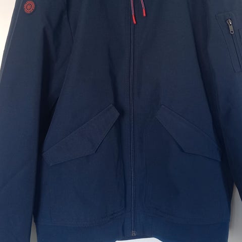 Flot marineblå jakke med lommer og hætte, helt ny .