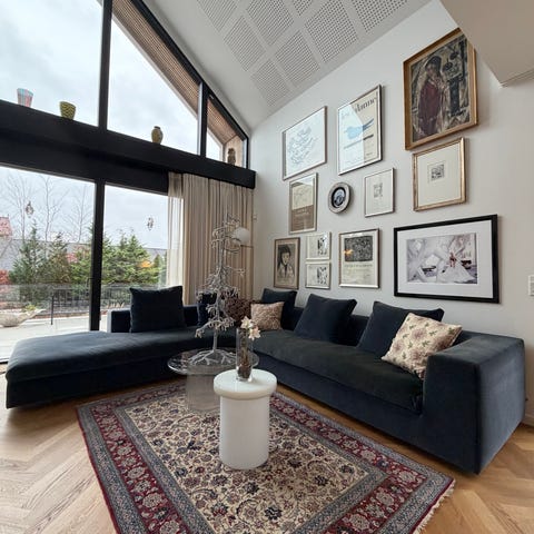 Den er 135*170 og står bedst i i et hjørne.