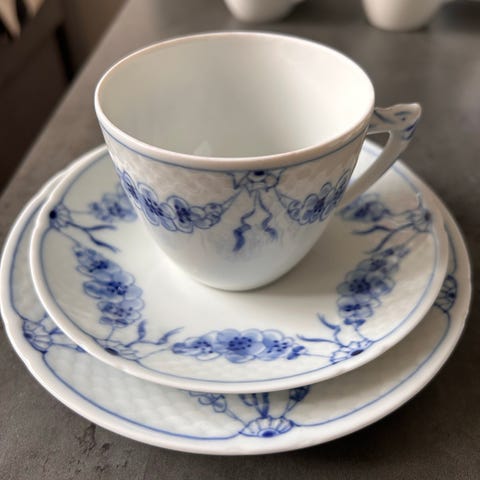 Mønsteret er Anemoneranker, og det var tiltænkt som en konkurrent til den kongelige porcelænsfabriks populære musselmalede stel.