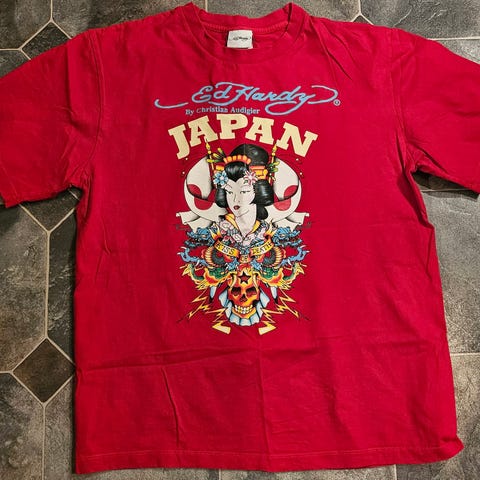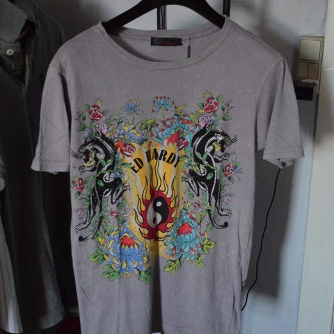 Christian Audigier Ed Hardy tanktop med kranie/hjerte/blomster-motiv. Har få brugspor, og meget få er perlerne er faldet af, men er udover det I pæn stand.