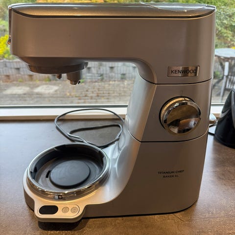Kenwood xl køkkenmaskine, med tilbehør som kødhakker og blender.
