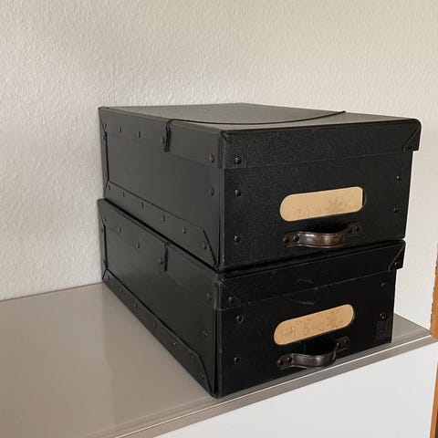 2 vintage opbevaringskasser, Ensfarvet blå og ternet blå/hvid med beslag foran. Fra 1970’erne. Ens størrelser: 47x30cm, 15cm høje. Evt til filmrekvisit. Fra ikke ryger hjem.