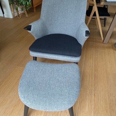 Ny produceret lænestol Model SK 2019. Kvalitets møbelstof i to forskellige farver: lyse grå og mørke grå. Bejdset massiv egtræ ben og negle - næsten sort venge farve. Løse sæde hynde af naturlig kokos måtte. Designet og fremstillet i Danmark