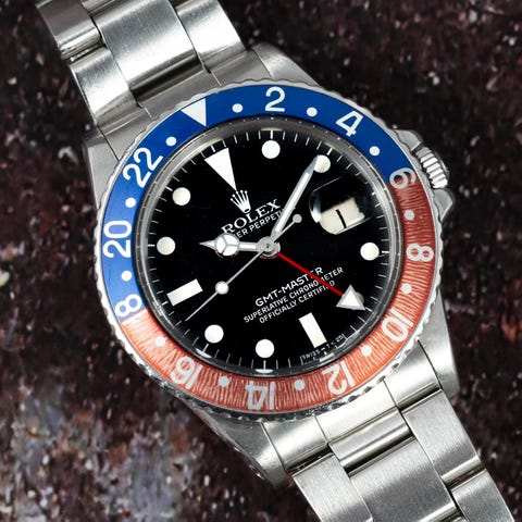 Klassik Rolex GMT med flot patineret Tritium skive og visere. Ydermere har skiven spider dial effekt. Uret sidder på en fin oyster lænke.