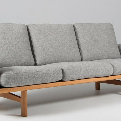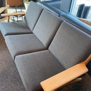 Hans J. Wegner tre personers sofa model GE-290/3 af sæbebehandlet eg. Nybetrukket med Hallingdal 130 fra Kvadrat. Fremstillet hos Getama. H. 71 cm Sh. 40 cm B. 180 cm. D. 84 cm. Fremstår med minimale brugsspor alder taget i betragtning.