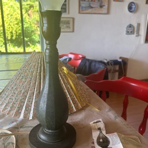 Smuk vintage bordlampe der måler 35 cm i diameter og 49 cm i højden. Lampen er i sortbejdset træ og med den originale hessian skærm. Er i god stand.