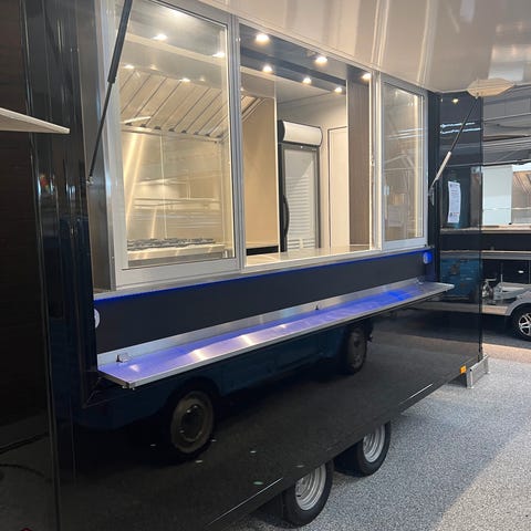 Stegeplade, grill, dobbelt friture, køl, frys, vask med kold og varm vand, op bygget i special højtryk laminat som er 100% vandtæt, med stål bordplader, led lys ved disk samt tavle ved disk, led lys inde i vognen, vognen, leveres med integreret el måler,