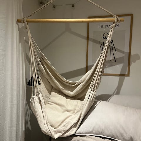 Hængekøje stol i sort stativ, flettet stol med pude.