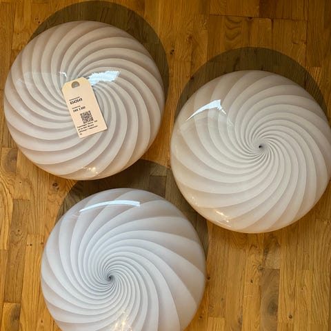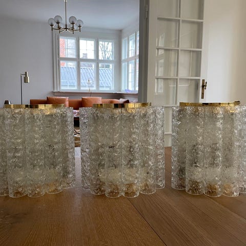Venini: Væglampe af messing og metal med plads til 12 bladformede glasskærme ilagt bladguld. Udført og mærket hos Venini, Murano. H. 93 cm. B. 46 cm. D. 29. cm. Ekstra skærme med følger, en med skade. Løsdele medfølger. Der skal trækkes ledning.