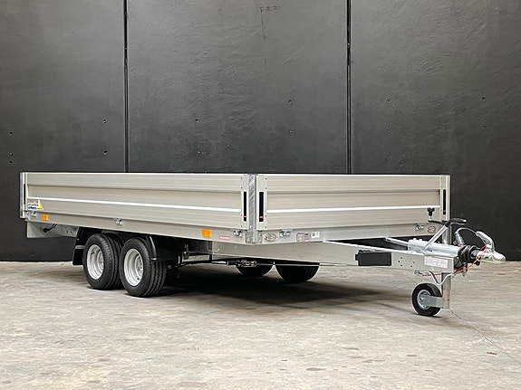 Stærk og robust boogietrailer med påløbsbremse, 4 nedfældige stålsider og 6 kraftige indvendige surringsøjer, nedsænket i bundplade samt kraftige 13" hjul.