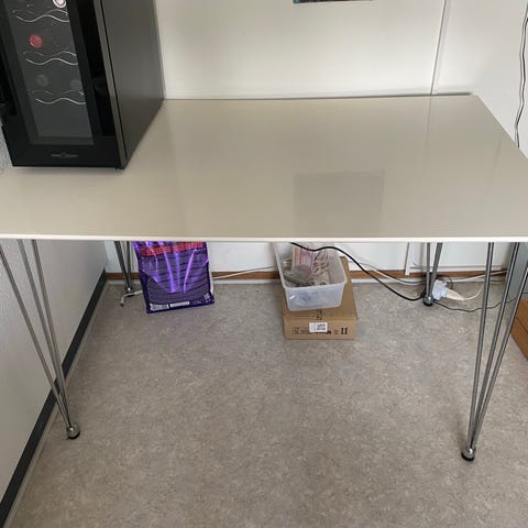 Spisebord, træ med justerbare stålben, Flot hvidt stabilt bord med justerbare stålben. Mål: 80 x 80 cm med justerbar højde fra 68 til 80 cm.
