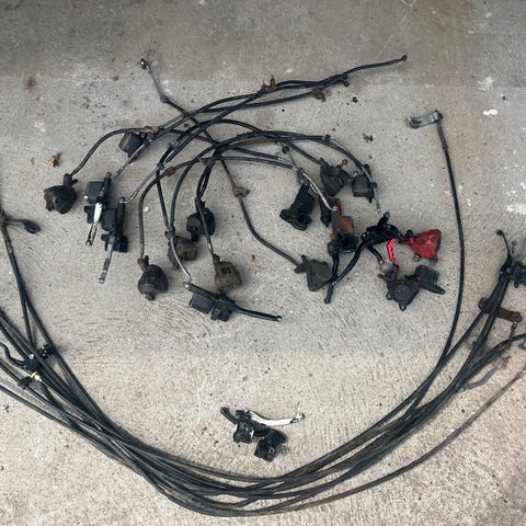 Pris for et sæt hjul bestående af for-og bagfælg med gode dæk monteret, bremseskive, bolte, bøsning, aksel og leje: 750 - 1200kr