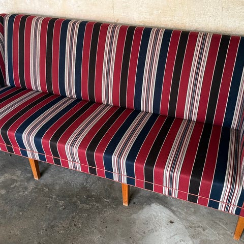 Kaare Klint propel taburet med stel af ask. Sæde udspændt med læder, bakke medfølger. Fremstillet hos Rud Rasmussen. H. 46 B. 50 L. 68 cm.