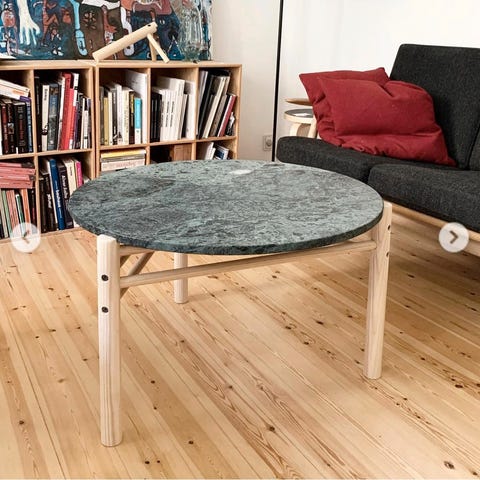 Sofabord fra 1970'erne med organisk formet stel. Udført i kunstmateriale med marmor look. H. 49 Ø. 60 cm.