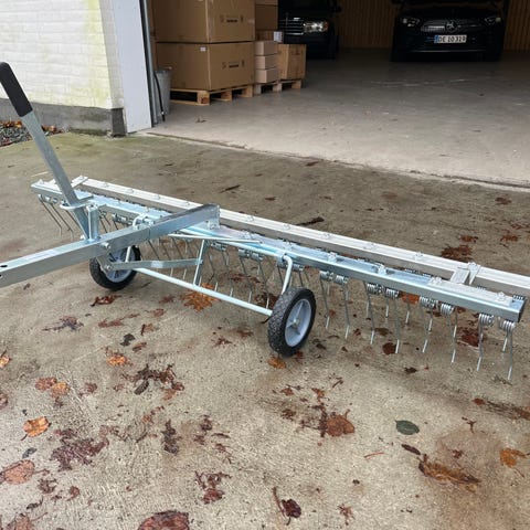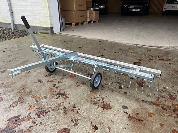 Kraftig konstrueret rive, som kan efterspændes havetraktor, rider eller ATV. Den er fremstillet i varmgalvaniseret stål med 9 dobbelt fjedre , ialt 18 tænder af 5mm fjederstål. Hver enkelt fjeder kan udskiftes ved slitage eller skade. Fra førersædet af en havetraktor kan du betjene håndtaget, som løfter riven fri af underlaget, og derved transporteres riven på de to 11 cm høje massive gummihjul.