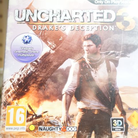 Uncharted 3 Drakes Deception til Playstation 3 PS3. Spillet er testet og kører perfekt.