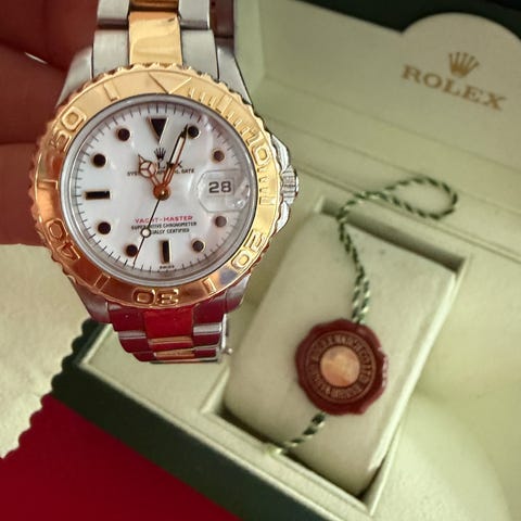 Dette Pearlmaster er fremstillet i 18 kt. guld, og det er udstyret med en bezel prydet med diamanter. Kombineret med en hvide skive og romertal, er den ikke en model, man ser ofte.