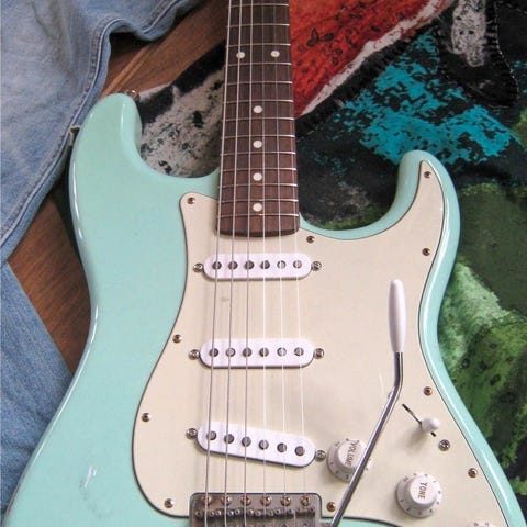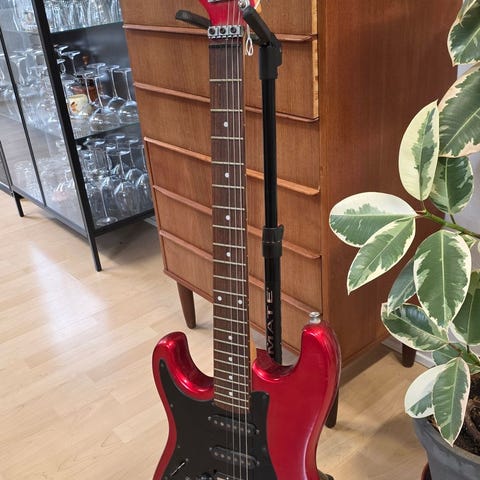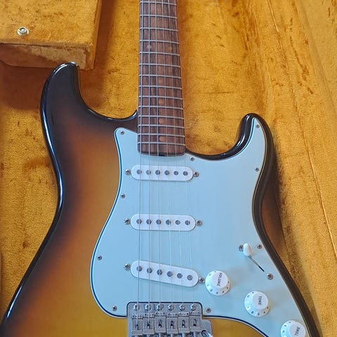 Tilbud.... Stratocaster håndbygget i USA. Hvis du elsker Mark Knopflers sound.... så er check lige denne håndbygget Stratocaster frs USA i en flot Dakota Red relic finish. Straten er en 63 model med rosewood fingerboard og vintage frets. Pickupperne er Seymour Duncans California 50' som har masser af fylde og crisp i tonen og et godt output. Pearl pickguard og en "out of phase" funktion på den ene tonekontrol som giver flere lydmuligheder end en alm. Strat. Masse af tone og en let spillet guitar som opfylder de flestes ønske til en god Stratocaster. Leveres i delux gigbag.