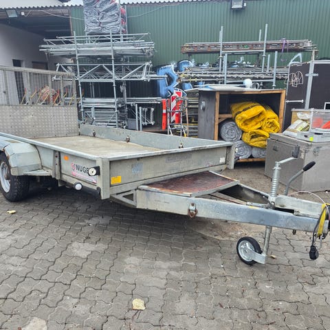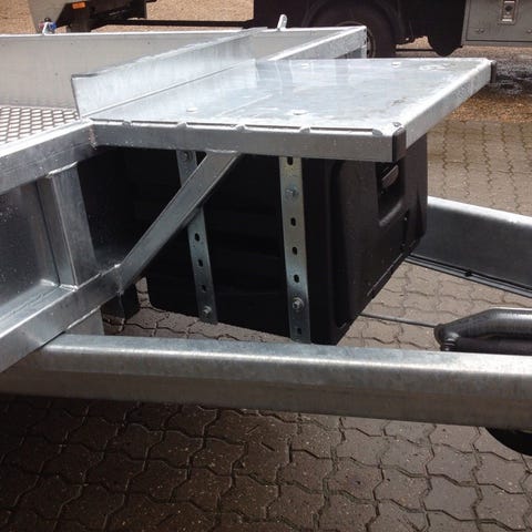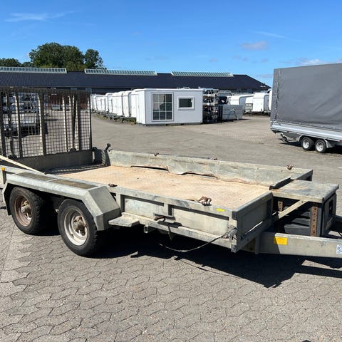 Meget stærk 3500 kg maskintrailer med rampe , alu bund , bindeøjer , bladfjedre 13" hjul , værkstøjskasse