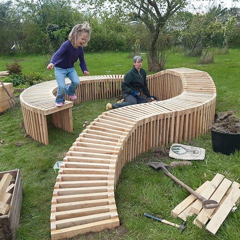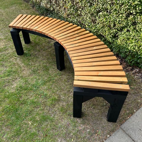 Nøglefærdig lamelbænk fra BIOBYG. Produceret i lækkert egetræ til leg og pynt i haven.