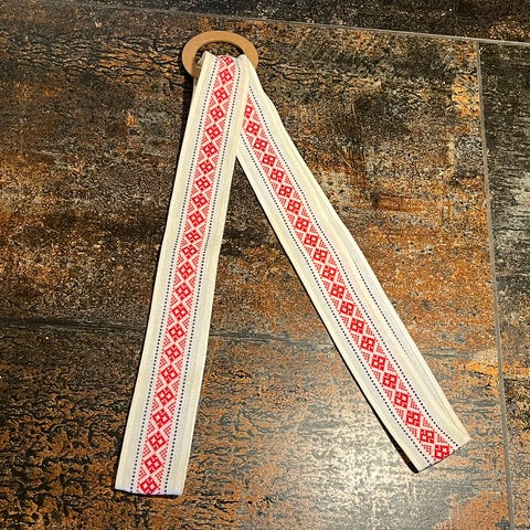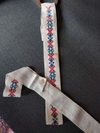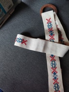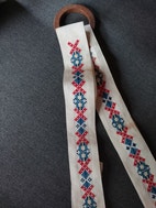 Håndbroderet, har 2 kapper/ knaphuller bagpå hver, træringen er også hjemmelavet.