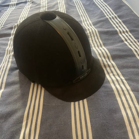 Total fed retro ridehjelm med sort velour, hage skål og øre kapper, så flot og velholdt.