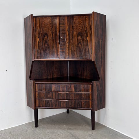 Dansk møbelarkitekt skab i fineret og massiv palisander med låger foroven og . 2 store opbevarings skuffer i bunden , indvendig med hyldeindretning